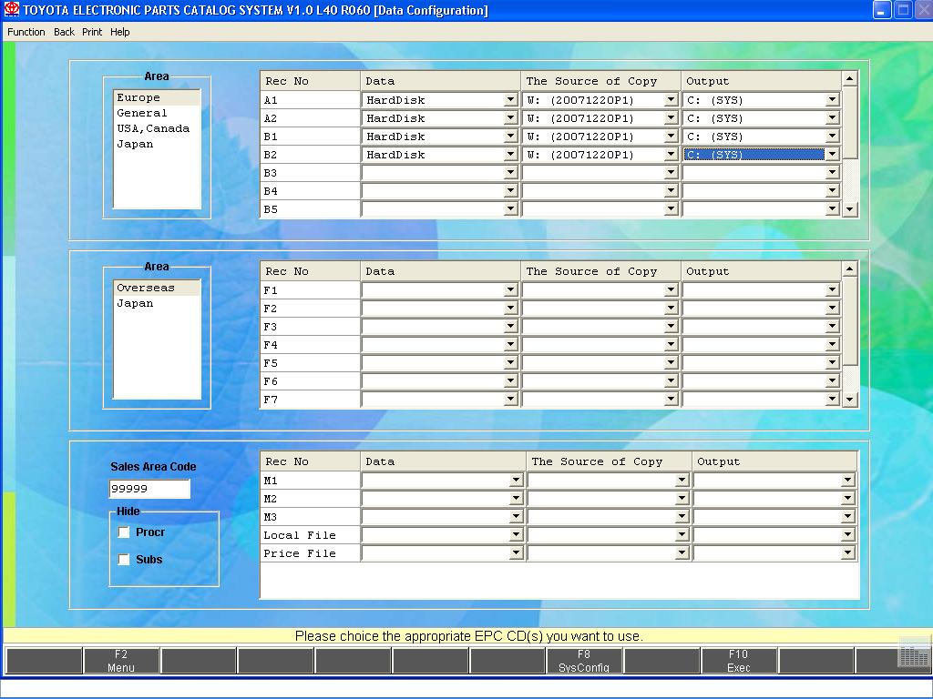 11. ÂÛÁÅÐÈÒÅ ÍÓÆÍÛÉ ÂÀÌ ÐÅÃÈÎÍ (ÍÀÏÐÈÌÅÐ ÅÂÐÎÏÀ) È ÍÀÏÐÎÒÈ ÊÀÆÄÎÃÎ ÄÈÑÊÀ (À1, À2, Â1 è.ò.ä.) ÓÊÀÆÈÒÅ ÒÈÏ ÓÑÒÀÍÎÂÊÈ ( ÊÎÏÈÐÎÂÀÒÜ ÍÀ HDD ÈËÈ ÐÀÁÎÒÀÒÜ Ñ CD), ÈÑÒÎ×ÍÈÊ ÄÀÍÍÛÕ È ÁÓÊÂÓ HDD, ÍÀ ÊÎÒÎÐÛÉ ÍÅÎÁÕÎÄÈÌÎ ÑÊÎÏÈÐÎÂÀÒÜ ÄÀÍÍÛÅ.  ÏÎËÅ Sales Area Code ÂÑÒÀÂÜÒÅ ÊÎÄ - 99999. ÍÀÆÌÈÒÅ ÊËÀÂÈØÓ F10. ÄÀÍÍÓÞ ÎÏÅÐÀÖÈÞ ÍÅÎÁÕÎÄÈÌÎ ÏÐÎÂÅÑÒÈ ÄËß ÊÀÆÄÎÃÎ ÐÅÃÈÎÍÀ  ÎÒÄÅËÜÍÎÑÒÈ.