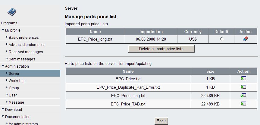 The maintenance screen can be reached by navigation in the menu "Server Management -> Parts Pricelist Administration".
