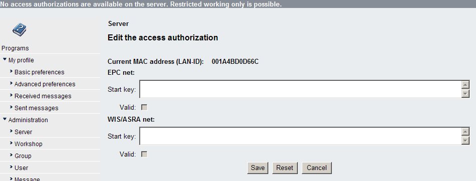 If you do not have access authorizations you will need to provide a unique ID of your system called "LAN-ID". By use of the main menu just click on "Server" and then on "Edit the access authorization".