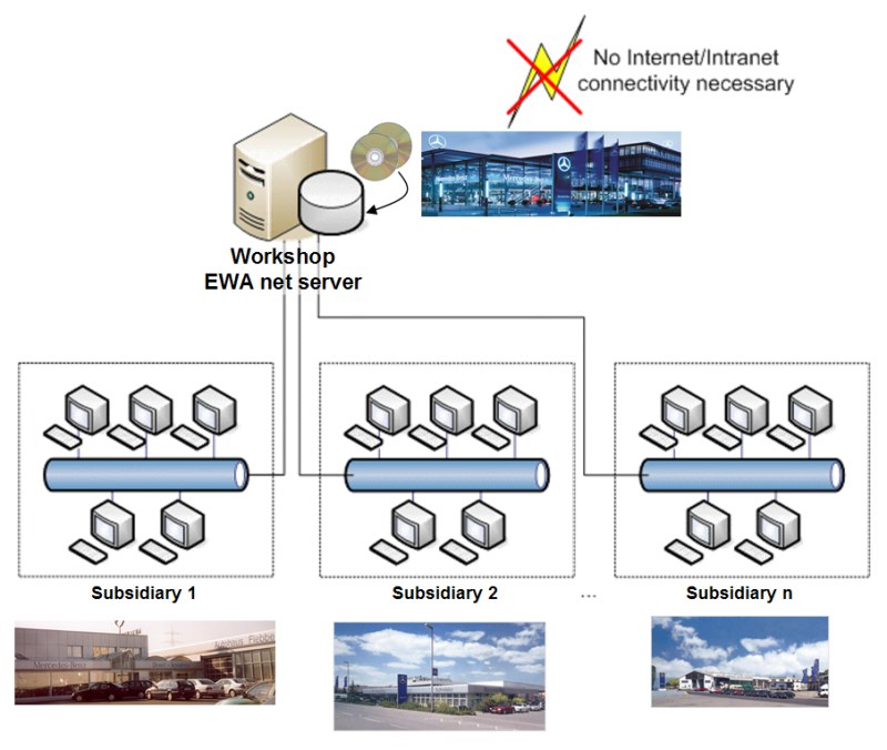 | Network / Internet | Users use an existing network connection or an Internet connection to access EWA from the MPC or other central instances (ASP). | The EWA server is located in a LAN in the dealer's environment - therefore no network connection from the workshop to the MPC or other central instances and no Internet connection is necessary. |