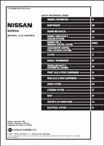 В технической литературе по ремонту Nissan Serena - C23 series / Vanette Cargo/E - HC23 series содержится подробное и полное описание ремонта и диагностики всех агрегатов автомобиля Nissan Serena - C23 series / Vanette Cargo/E - HC23 серии, моменты затяжек, процесс сборки и разборки двигателя и других агрегатов и узлов, кузовные размеры для вытяжки кузова, подробный ремонт АКПП и МКП, ремонт сцепления, рулевого управление, кондиционера, всех электрических устройств и блоков управления, необходимый специальный инструмент, а так же другая информация Nissan Serena - C23 series / Vanette Cargo/E - HC23 series.